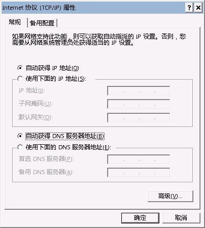 设置自动获取 IP地址方法如下: 1.打开控件面板,点击网络连接图标,如下图: 2.双击本地连接图标,点击本地连接状态的属性按钮,如下图: 3.选择本地连接属性对话框中的"Internet协议(TCP/IP)“,然后点击”属性“按钮,如下图: 4.在"Internet协议(TCP/IP)属性"对话框中选择“自动获得IP地址“和“自动获得DNS服务器地址“,然后单击确定按钮,如下图: