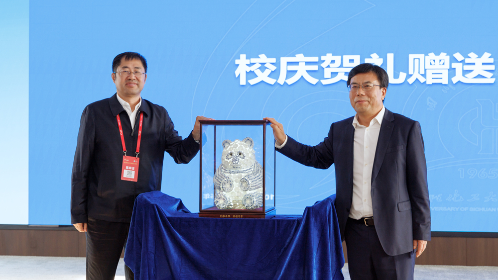 在温馨的互赠礼物环节,蒋传海代表华东理工大学赠送校庆贺礼——由非遗连环画传承人罗希贤先生领衔创作、历时半年精心打造的6.52米长《“652工程”历史长卷》及配套画册;我校则回赠了由学校校友、自贡彩灯非遗传承人万松涛制作的瓷器手工捆扎技艺灯品国宝熊猫。一盏灯,照亮前行路;一份礼,凝聚两校心。它们不仅是两校友谊的象征,更是两校在新征程上携手同行的历史见证。