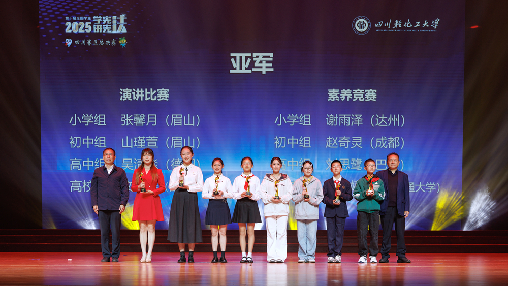 颁奖典礼在庄严的国歌声中拉开序幕。学校党委书记张力代表学校致辞,对与会领导、嘉宾、老师及同学们表示热烈欢迎,对获奖集体和个人表示衷心祝贺。他表示,能够承办此项高水平赛事,既是对我校60年办学积淀的充分肯定,又是对我校长期以来坚持依法治校、深化法治宣传教育成果的一次集中检阅,更是对我校进一步强化办学特色、提升服务社会能力、营造浓厚校园法治文化的有力促进与鞭策。学校将以此次盛会为新起点,深入学习贯彻习近平法治思想,不断深化法治教育改革创新,为培养更多具备坚定理想信念、崇高道德情操、扎实学识素养和深厚法治情怀的时代新人而努力奋斗,为谱写中国式现代化四川新篇章贡献更多的教育智慧和法治力量。