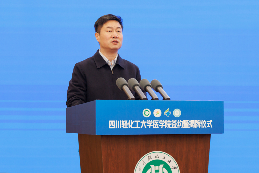 曾洪扬代表市委、市政府向医学院的成立表示热烈祝贺。他说,近年来校地双方共同推动建立中国彩灯学院、氟材料产业学院、无人机产业学院等现代特色产业学院,建成投用李白河校区,打造了校地“双向赋能”的典范样板。此次四川轻化工大学与四川卫生康复职业学院、自贡市第一人民医院、自贡市第四人民医院共建医学院,既是贯彻“健康中国”战略、服务教育强国建设的务实行动,也是校地深化情谊、合作共赢,携手推动高质量发展的又一标志性成果。希望四川轻化工大学坚持高标准建设,积极布局一批引领产业发展、契合健康事业需要的特色优势学科,打造辐射西南、面向全国的跨学科创新型医学院;突出高水平教学,加强师资队伍建设,不断提高办学质量和水平,打造高素质复合型医学人才培养的摇篮;助推高质量发展,持续创新校地校企合作模式,推动产学研用一体化发展,为自贡经济社会发展提供有力支撑。